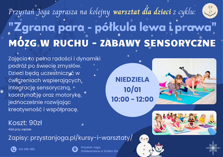 Zapraszamy dzieci na kolejny warsztat z cyklu „Zgrana para, półkula lewa i prawa”, który łączy ruch, zabawę i elementy jogi w atmosferze radości i kreatywności.